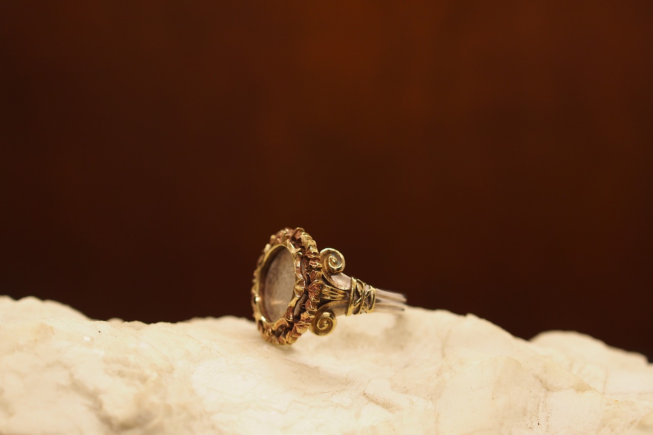 神殿の建造物を思わせるような装飾が施されたリング。