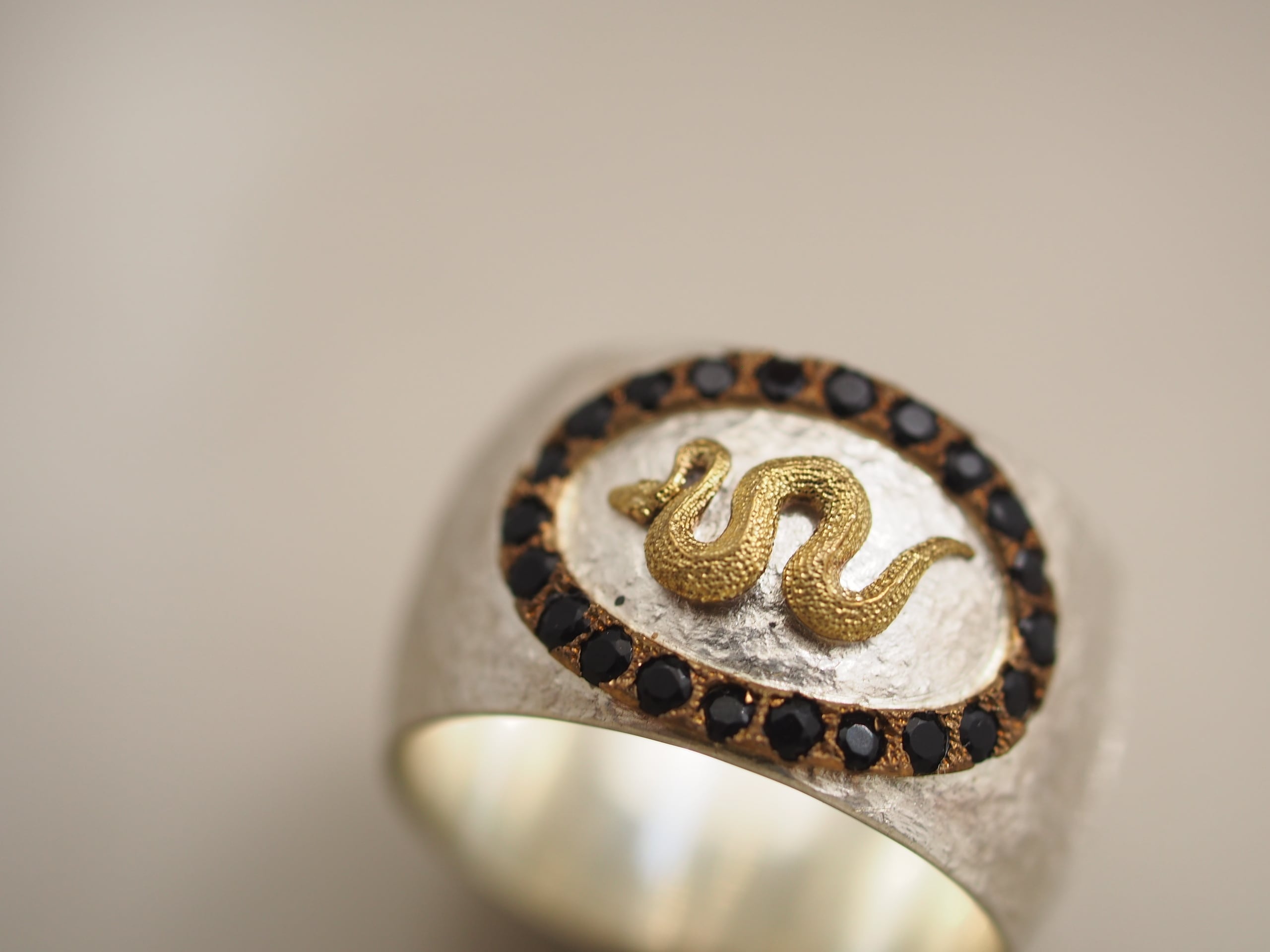 深く落ち着いた輝きを放つオニキスと蛇のモチーフが印象的なリング。