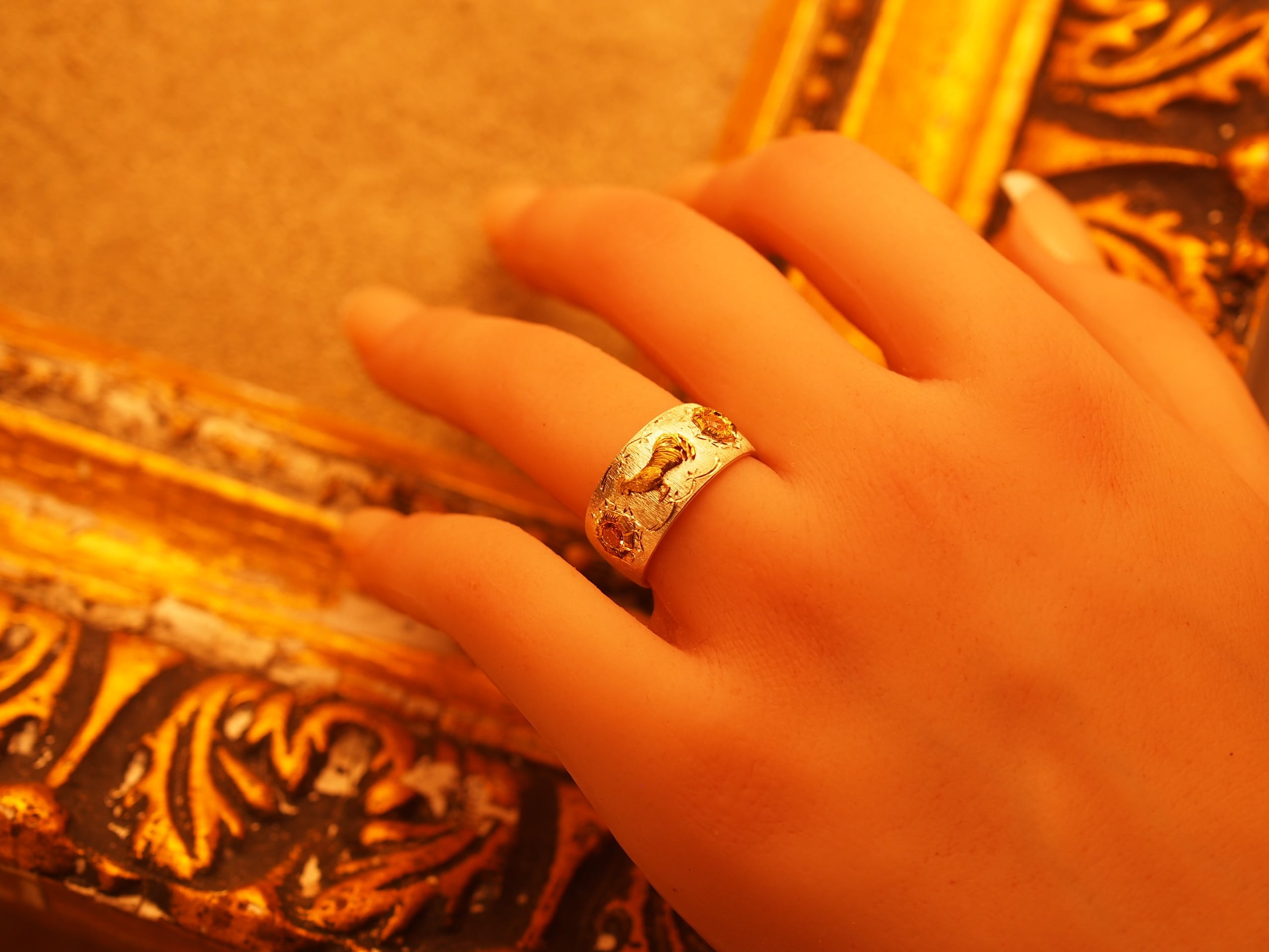 ニワトリのモチーフに上品なシャンパンカラーを添え、手彫りの表情がきらりと映えるリング。