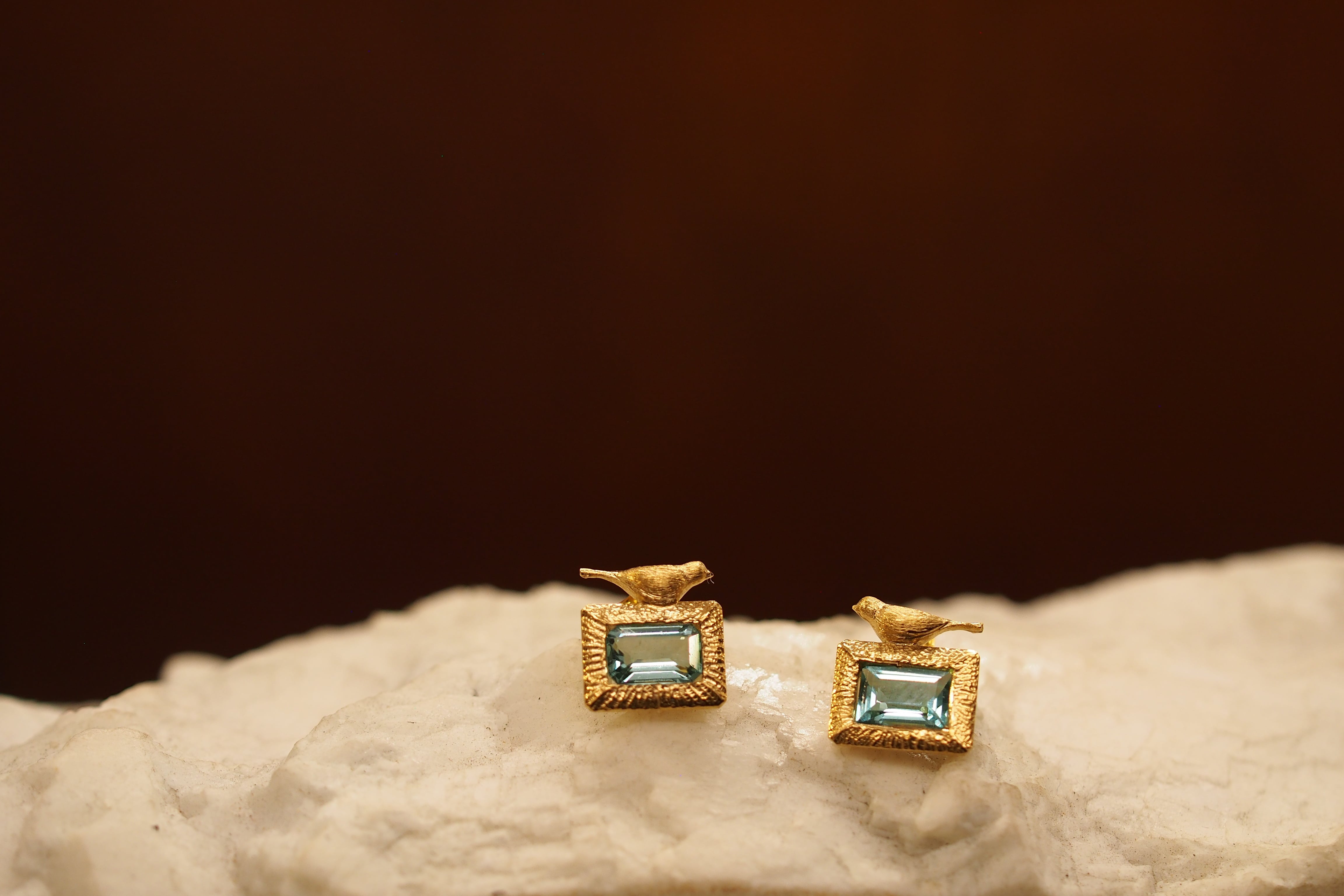 小さな立体の動物(ことり)と宝石を組み合わせたピアス。